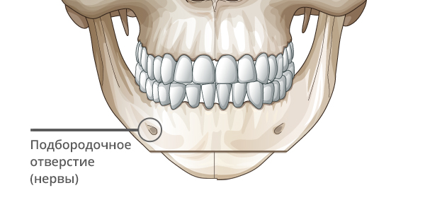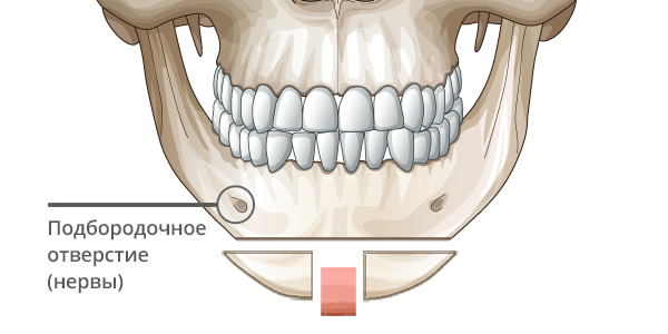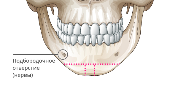 Используйте Т-остеотомию на краю подбородка, избегая нервных линий.